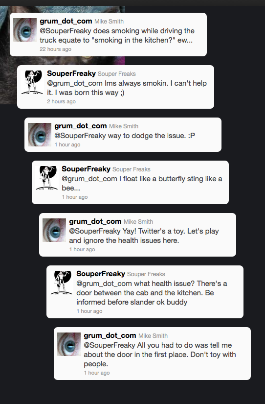 Also, was there any slander in there on my part? I don’t think so. Was just reporting the facts as I witnessed the driver smoking while they drove the food truck by my office. And for the record, I love the food truck concept. I support them.